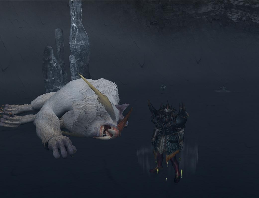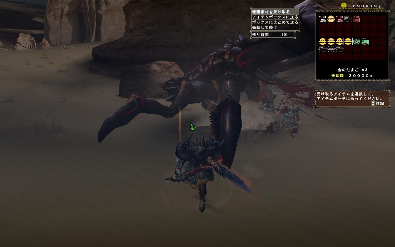 で、白い猿を乱獲・・・奇跡的に7回中7個全部出た、問題はティガの鋭牙だ!1日目は軽い気持ちでやっていたら5%ほどの頭殻ばっかり出て鋭牙が出ない!3時間ティガを粘りました、結果1個だけ出たよ、先がすごく遠く思えた瞬間だった。